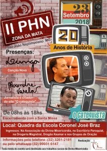 Pela segunda vez, no próximo dia 23 de setembro, o município de São João Nepomuceno recebe o PNH Zona da Mata, uma realização da Associação da Divina Misericórdia. A Quadra da Escola Coronel José Braz será a sede do encontro, que pretende reunir os jovens da região levantando a bandeira do PHN (Por Hoje Não).