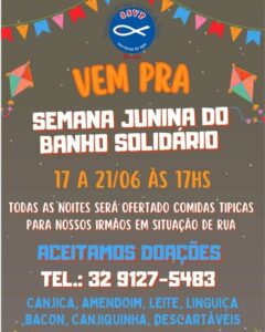 A Semana Junina do Banho Solidário começou nesta segunda-feira e se estende até sexta-feira, dia 21 de junho. A partir das 17h, são ofertas comidas típicas, acolhimento e animação.