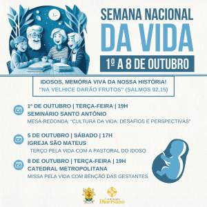 A partir desta terça-feira (1º), as comunidades, paróquias, dioceses e arquidioceses de todo o país celebram a Semana Nacional da Vida. Neste ano, os encontros abordarão a importância dos idosos para as famílias, para a sociedade e para a evangelização, com o tema “Idosos, memória viva da nossa história” e o lema “Na velhice darão frutos” (Salmos 92, 15).