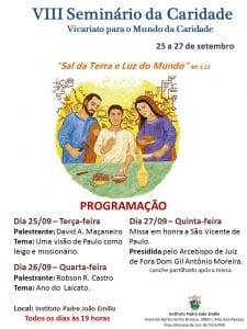 Entre os dias 25 e 27 de setembro, o Vicariato Episcopal para o Mundo da Caridade da Arquidiocese de Juiz de Fora promove a oitava edição do seu Seminário da Caridade. O evento, que será realizado no Instituto Padre João Emílio, terá suas atividades regidas pelo tema “Sal da terra e luz do mundo” (Mt 5,13).