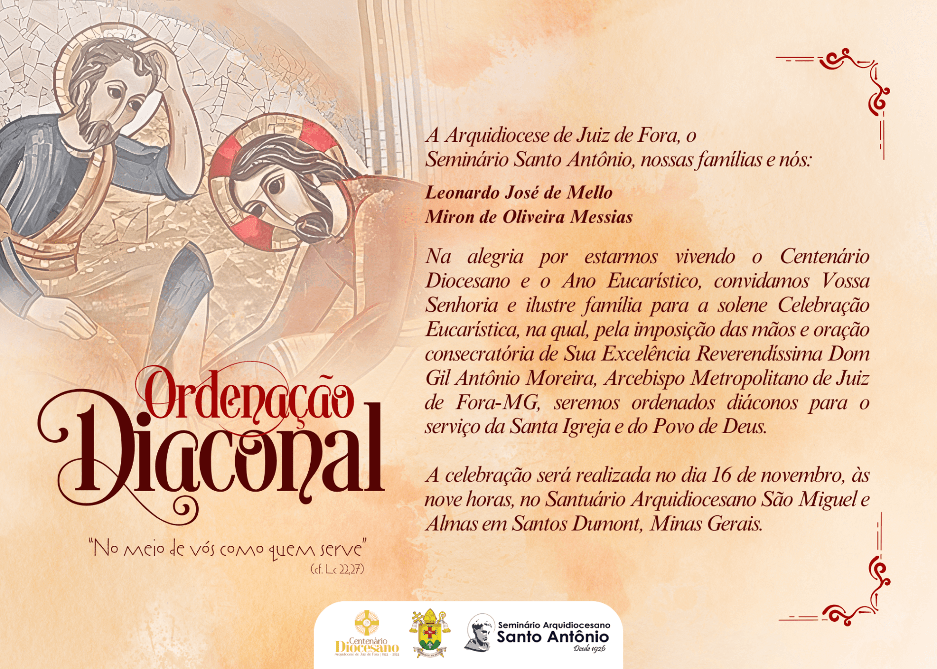 Na manhã do próximo sábado, 16 de novembro, acontecerá a Ordenação Diaconal dos seminaristas Leonardo José Melo e Miron de Oliveira Messias, um novo passo em suas vocações rumo à ordenação presbiteral. A celebração será no Santuário São Miguel e Almas, em Santos Dumont (MG), sob o lema “No meio de vós como quem serve” (Lc 22,27).
