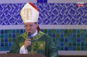 No início de sua homilia, o presidente da Comissão Episcopal para a Animação Bíblico-Catequética da CNBBf ez uma associação à Primeira Leitura: temos que ouvir mais a palavra de Deus. “A palavra catequese significa ecoar, ou seja, entrar pelo ouvido, então sair pelo outro, é para levar para o coração. A Fé nasce da escuta, e muita gente está perdendo a fé porque não escuta mais, só quer falar. Sabe quando passamos por uma provação difícil? Aquela morte repentina, brigas na família, mal-estar no relacionamento, problemas no trabalho… Logo a gente reza e pede ajuda, mas nessa hora é preciso escutar o que Deus quer nos dizer. Com isto, é preciso querer aprender de Deus o que ele está nos mostrando através da dor. Como bem diz Padre Zezinho em uma de suas canções, ‘Ninguém nasceu para sofrer, mas a dor nos faz crescer’.”.