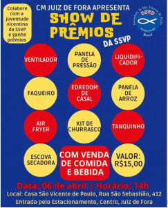 No próximo domingo, 6 de abril, a Comissão de Jovens do Conselho Metropolitano de Juiz de Fora (CJCMJF) promoverá a edição anual do Show de Prêmios da Juventude Vicentina. O evento terá início às 14h, na Casa São Vicente de Paulo.