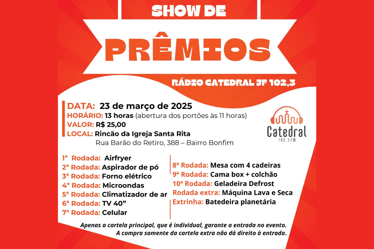 A Rádio Catedral FM 102,3 promove, no dia 23 de março, a partir das 11h, mais um Show de Prêmios, no Rincão da Igreja Santa Rita de Cássia. Ainda é possível adquirir cartelas, estão à venda por R$ 25, dando direito a dez rodadas.