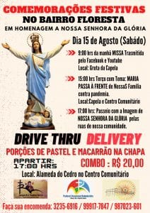 A venda dos pastéis e macarrão na chapa será através de delivery ou drive-thru, no Centro Comunitário. A paróquia pede que os pedidos sejam feitos antecipadamente através dos telefones (32) 3235-6916, (32) 99917-7847 ou (32) 98702-3601.