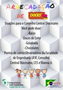 O Conselho Central Diocesano da Sociedade de São Vicente de Paulo (SSVP), em parceria com a ONG Engenheiros Sem Fronteiras, está promovendo uma campanha de arrecadação de doces. A iniciativa tem como objetivo angariar guloseimas para a produção dos kits a serem entregues às famílias assistidas no Dia das Crianças.