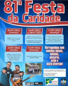 A programação segue em 23 de julho, com o tradicional leilão e apresentação da banda da Escola de Música Maximiano Nepomuceno. No dia 31, a festa será encerrada com a Feijoada da Caridade. Em todos os dias haverá funcionamento de barraquinhas de comidas típicas, pescaria e outras brincadeiras.