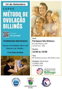No dia 14 de setembro, a Paróquia São Mateus, em Juiz de Fora, sedia o próximo treinamento sobre Paternidade Responsável e o Método de Ovulação Billings (MOB). O encontro será realizado das 13h às 19h e é voltado principalmente aos casais que desejam aprender a planejar sua família com um Método Natural de Ritmos de Fertilidade de base científica.