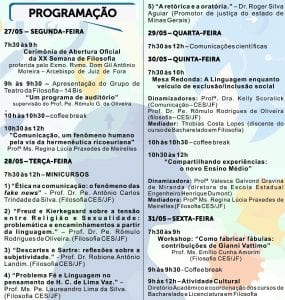 Até sexta-feira (31), os inscritos poderão participar de minicursos, workshop e assistir a mesas redondas. Durante a semana, toda a programação da XX Semana de Filosofia será realizada entre 7h30 e 12h. O tema que regerá o evento será “Filosofia, linguagem e comunicação: construção de sentidos e realidades”. Os interessados podem se inscrever no site do CES/JF.
